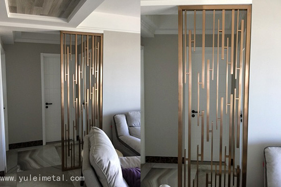 现代简约室内装饰,对人们心境都有舒缓调节的作用。更有些文章说:回到家,看到简约不锈钢屏风,心情马上好了。对于大多数的年轻人来说,事业的压力、繁琐的应酬让他们需要一个更为简单的环境给自己的身心一个放松的空间。不拘小节、没有束缚,让自由不受承重墙的限制,是不少消费者面对家居设计师时最先提出的要求。而在装修过程中,相对简单的工艺和低廉的造价,也被不少工薪阶层所接受。家居不锈钢屏风就适合每个家庭的装饰。拉丝钛金简易不锈钢竖条屏风效果图