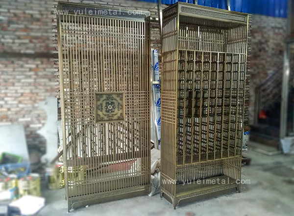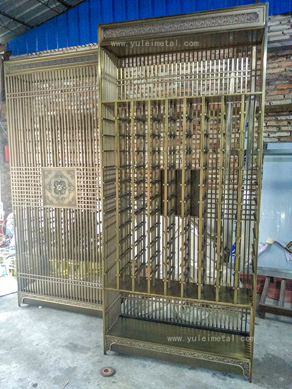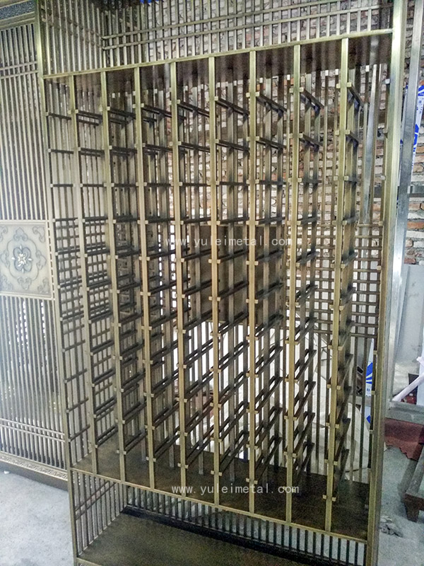 拉丝青古铜不锈钢酒架,中式风格红酒,直捅型拿放酒架结构,使用20x20不锈钢方管加工,酒架顶部四周、酒架底部四周搭配铝雕雕刻装饰图案,装饰设计颇为讲究。