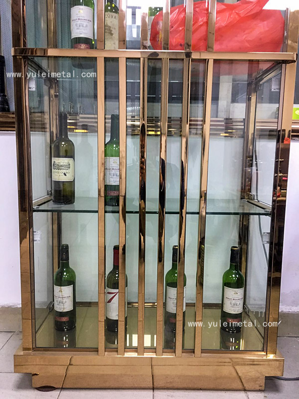 镜面玫瑰金定制不锈钢酒架正面图片:酒架以玻璃板作为承酒托层,竖放型设计。