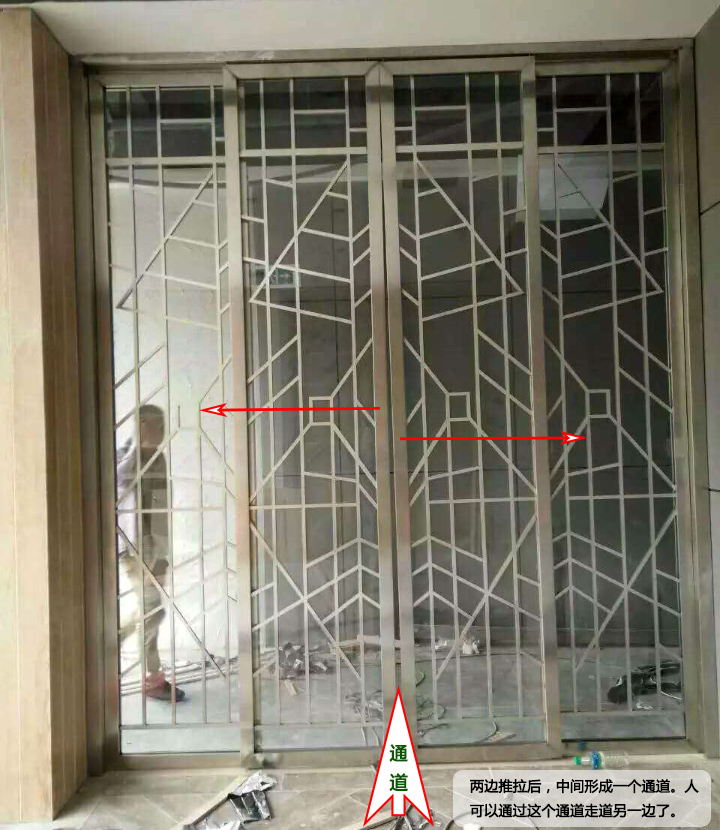 屏风隔断还有推拉活动门的功能,当人们需要在这个门洞通过的时候,中间的两扇屏风隔断分别往两边移动,就能成为一个通过的门口,人们就能通过这个门口从这个空间走到另外一个空间了。请看下面的不锈钢活动屏风隔断墙活动功能示意图: