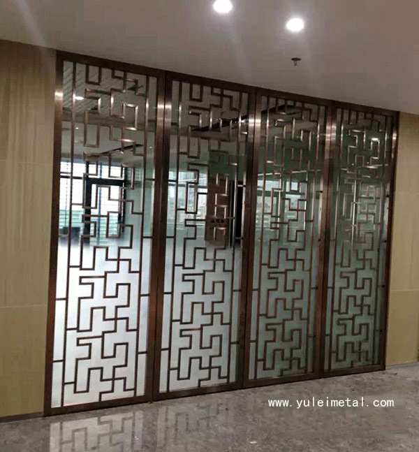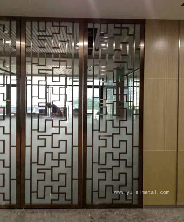 在很多大型的办公楼不锈钢工程项目,都会选用一些比较小巧玲珑小型的不锈钢屏风隔断装饰设计,同时要求屏风隔断还具备了取光,通风透气,隔断等多重功能.下图4幅中式花格不锈钢屏风隔断就做到了.这个是工程安装师傅在现场安装完毕后拍摄回来的图片,在室内往室外拍摄,刚好看室外充足的光线反射进来,室内可以获取少量的自然光线,由于花格的透气性,也是室内的空气与室外的空气保持顺畅的沟通.
