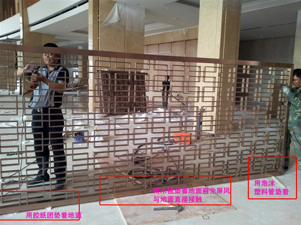 这是一家酒店的玫瑰金不锈钢花格屏风工程的安装项目施工现,据图片时间记载是早在2011年时候做的。在不锈钢屏风工厂加工好成品的玫瑰金屏风之后,用木箱打包,统一运送到工地然后再进行安装。下面为大家解析一下不锈钢屏风安装工程的现场传回来的图片,为大家阐述一下现场安装的工程师们都会做些什么。