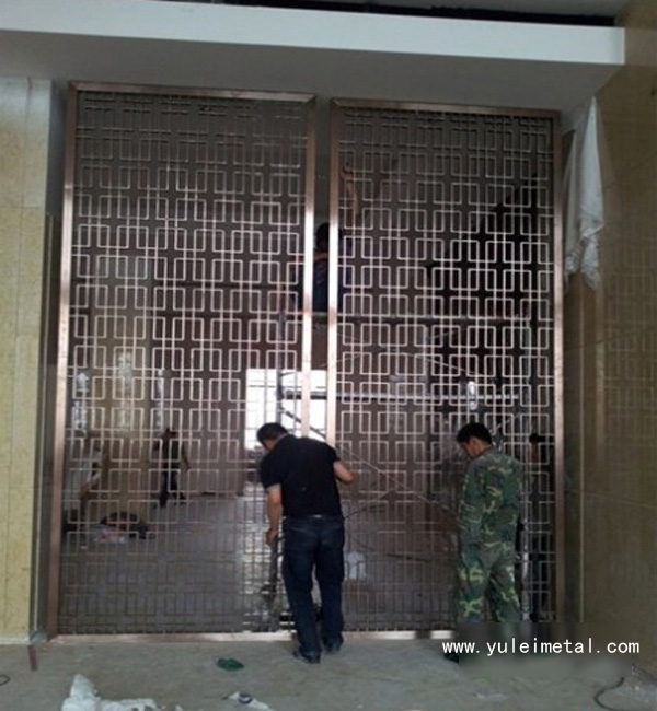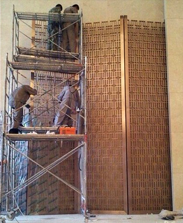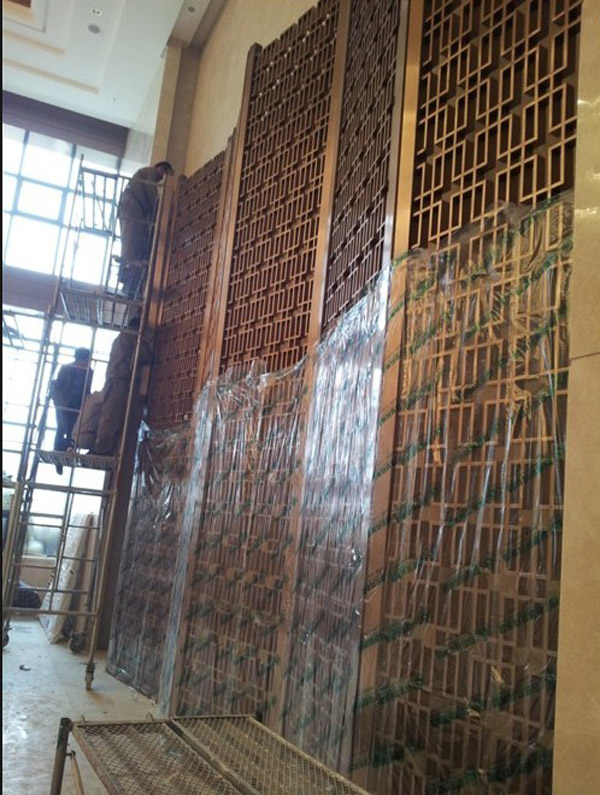 4、在不锈钢屏风工程项目安装的现场,有一些做得比较细节的工程师们,还会使用胶纸将屏风的表面覆盖起来,这层胶纸就有防尘作用。一般来说,酒店不锈钢屏风工程项目现场都是比较大尘的,如果不是用胶纸覆盖屏风表面的话,等到整个项目全部做完的时候,屏风花格的表面都已经积下了厚厚的灰尘,清洁的时候,如果不注意的话,因为有了厚厚的灰尘而用力清洗,往往就会弄花屏风的表面,不好看了。