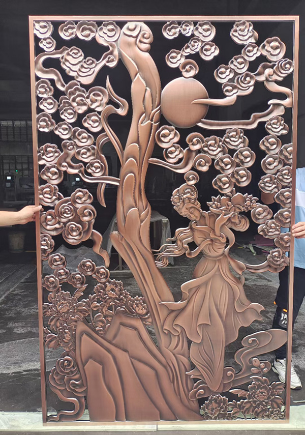 简介:12mm厚铝板浮雕屏风,双面效果,电镀红古铜。适合安装中式别墅屏风隔断。